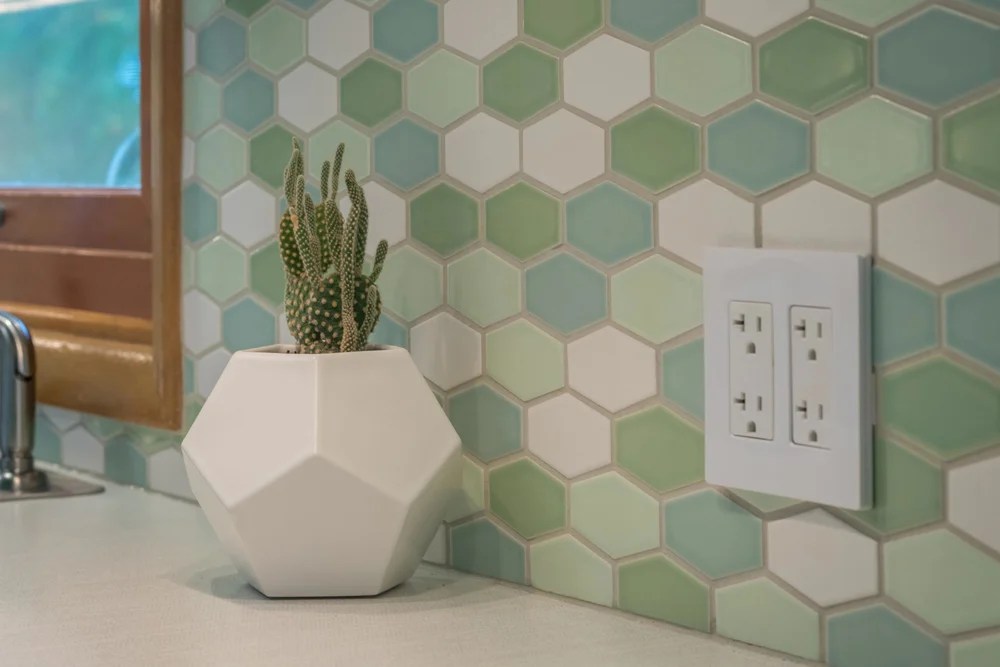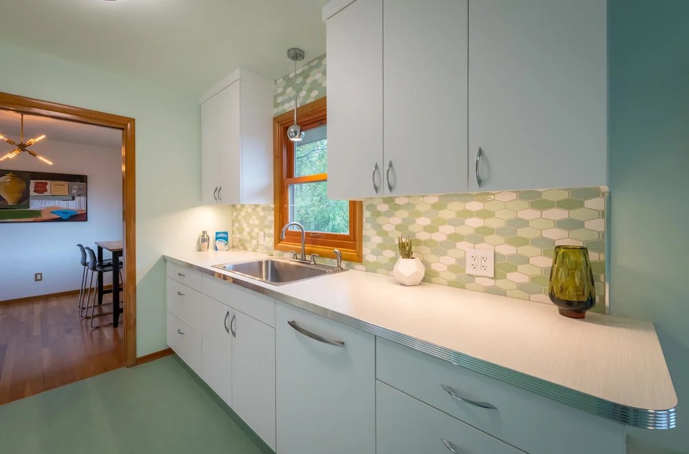 A retro kitchen remodel for this Portland kitchen with gorgeous, handcrafted, elongated hex tiles in a color scheme from a recently released palette.