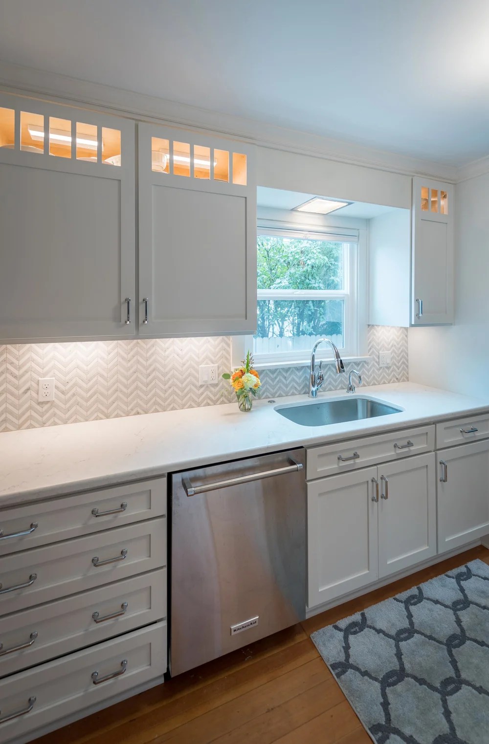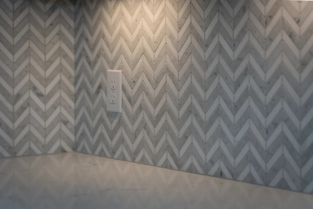 A marble chevron backsplash in this kitchen renovation brought a high level of elegance while respecting the character and period of the home.