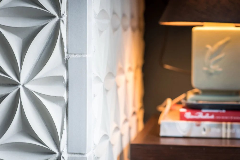 Sculptured tile on the fireplace, European patterned tiles on the floors and subway tiles in the mudroom compliment each other and tie these three spaces together.